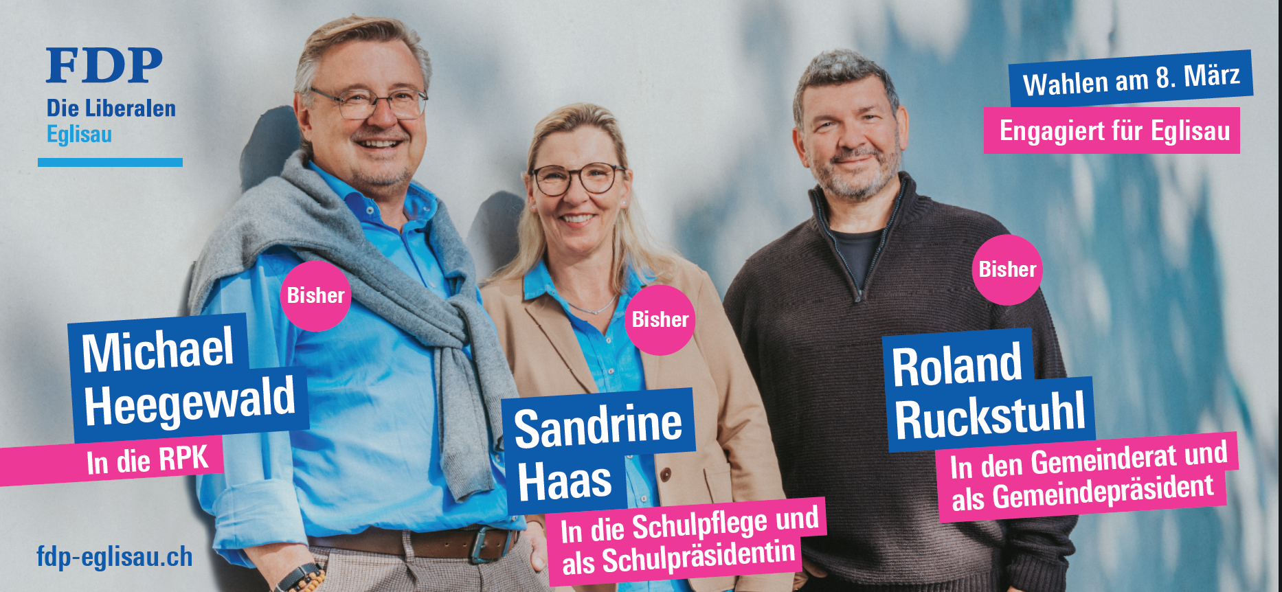Am 8. März 2026 stellt die FDP Eglisau für den Gemeinderat, die Schulpflege und die RPK Kandidierende